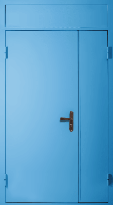 Если ширина и высота проема нестандартные, удобнее всего установить полуторные технические двери с глухим полотном и фрамугой. Статичная створка оснащена петлями и вертикальными штырями, что позволяет открывать ее в случае необходимости.